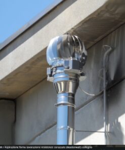 Questo aspira-fumo per camini è robustissimo , non vengono utilizzati particolari realizzati con lamiera zincata ma abbiamo utilizzato solo acciaio inox e alluminio pressofuso compresa la bulloneria , è un comignolo eolico motorizzato costruito per durare nel tempo, può essere ribaltato di 90° per l’ispezione della canna fumaria.