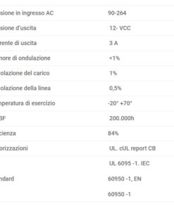 La centralina di alimentazione accetta in ingresso una tensione di rette che può variare da 90 a 246 VAC, questa caratteristica ne permette l’utilizzo in tutti quei paesi dove la rete elettrica è particolarmente instabile , sia in tensione che in frequenza, l’alimentatore alloggiato internamente alla centralina è uno switching, questa caratteristica lo rende completamente slegato dalla frequenza di rete non ne subisce le eventuali variazioni.