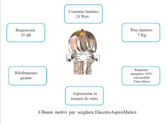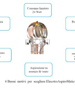 Il problema si pone quando in mancanza di vento l’aspiratore tradizionale non ruota e quindi non può creare nessuna depressione, con ElectroAspiroMatic motorizzato si risolve il problema.