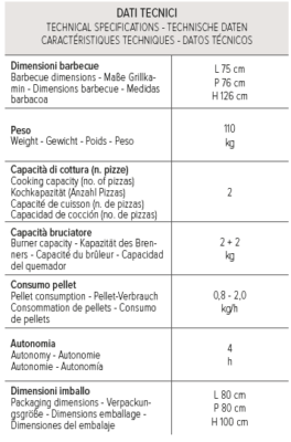 Dotato di ruote per una facile movimentazione, doppio bruciatore in acciaio inox per ottimizzare la temperatura di cottura. Adatto per circa 2 pizze diam. 30 cm.