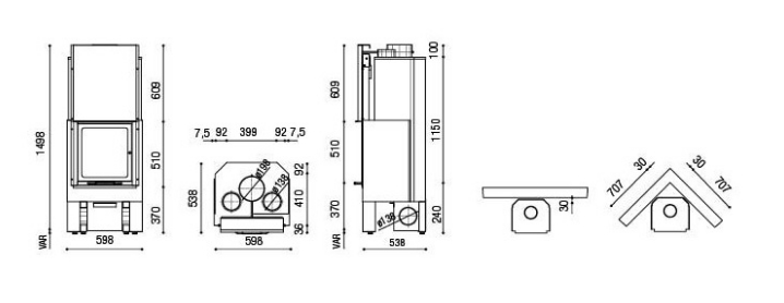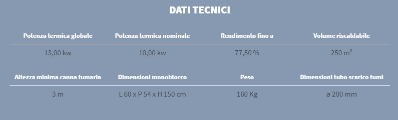 Monoblocco frontale realizzato in acciaio COR-TEN dello spessore di 3 mm. Dotato di piedini regolabili, con focolare in refrattario, si può posizionare ad angolo o a parete. Portina in vetro ceramico resistente a 800°C con apertura a saliscendi e ad anta per la pulizia del vetro. Completo di kit ventilazione forzata da 800 m3/h.