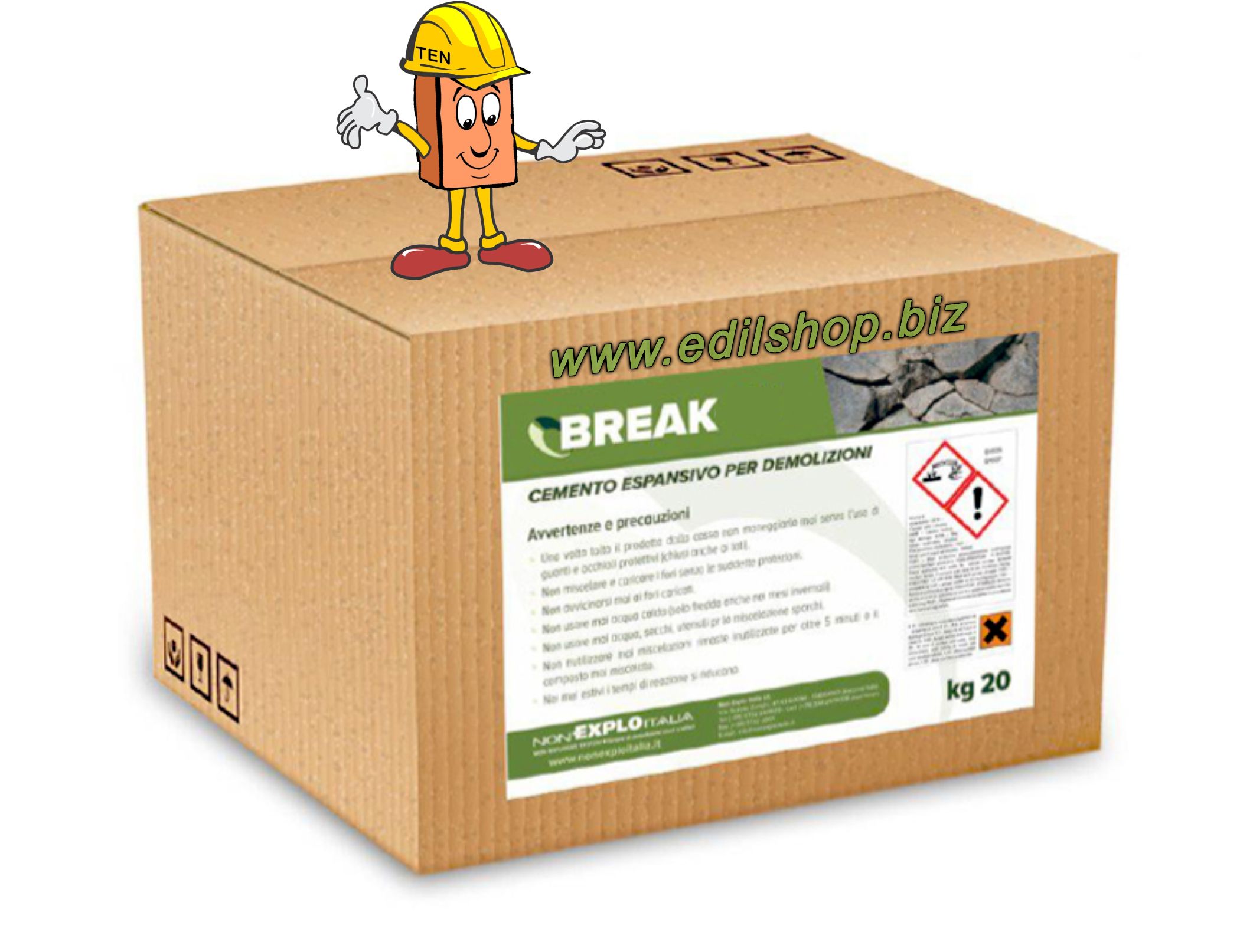 Il BREAK, omologo del più conosciuto BRISTAR, è prodotto in Italia ed è una malta espansiva non esplosiva che ha la proprietà di demolire in tutta sicurezza roccia e calcestruzzo senza produrre rumore, vibrazioni, lanci di detriti o inquinamento ambientale.