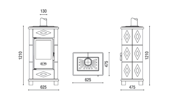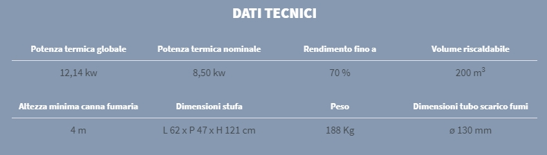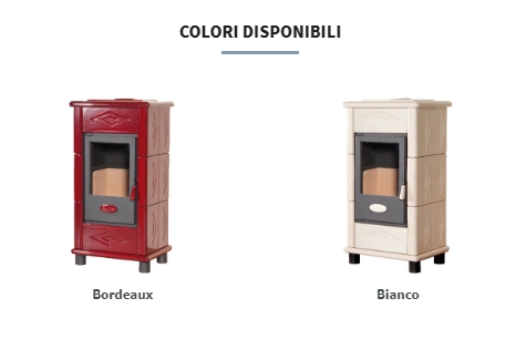 In questo modello il focolare si sviluppa verticalmente permettendo una coreografica visione della fiamma grazie all’ampio vetro ceramico resistente a 800°. Le guarnizioni della porta sono in fibra ceramica. La stufa Calla a convenzione naturale è trasformabile, con l’installazione dell’apposito kit, in versione a ventilazione forzata ed è predisposta di due uscite posteriori per la canalizzazione dell’aria calda. Il rivestimento è in maiolica della migliore qualità, la struttura è in acciaio corten e il pratico cassetto porta cenere con griglia è posto direttamente sotto al focolare.