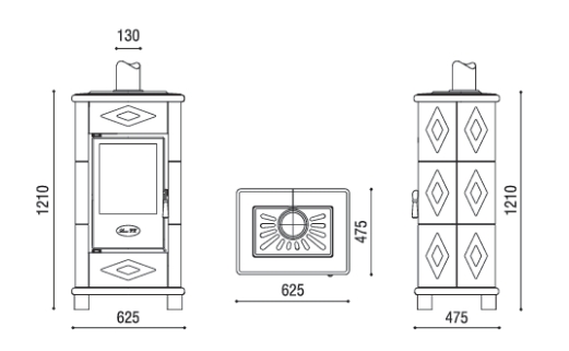 La stufa Edera a convenzione naturale, con rivestimento in maiolica della migliore qualità, struttura in acciaio corten con pratico cassetto porta cenere posto direttamente sotto al focolare, armoniosamente completata da un forno in acciaio inox AISI 304, di spessore mm 1,5 con dimensioni 370x325x28 cm.