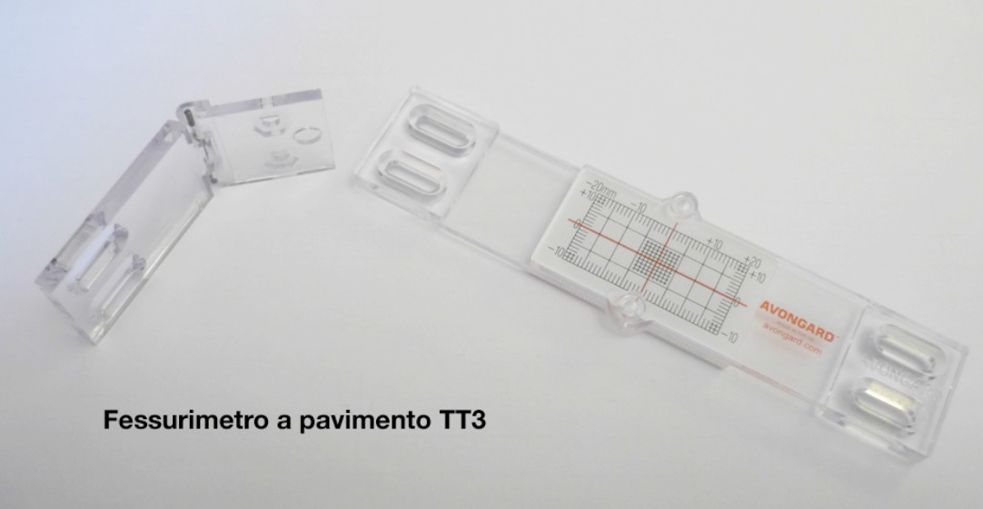 Fessurimetro a pavimento TT3in policarbonato tecnopolimero con filtri UVParticolarmente indicato per rilievi in esterni e per monitoraggi molto prolungati nel tempo.Grafica fotoincisa per resistere a condizioni ambientali difficili (lunga esposizione al sole, alleintemperie)Dotato di perni di bloccaggio per un più facile montaggio.I perni tengono le due piastre bloccate con la croce di riferimento perfettamente coincidente con lozero della griglia. Vengono rimossi una volta incollato/fissato il fessurimetro al muro.NON è dotato dei riscontri per calibro.