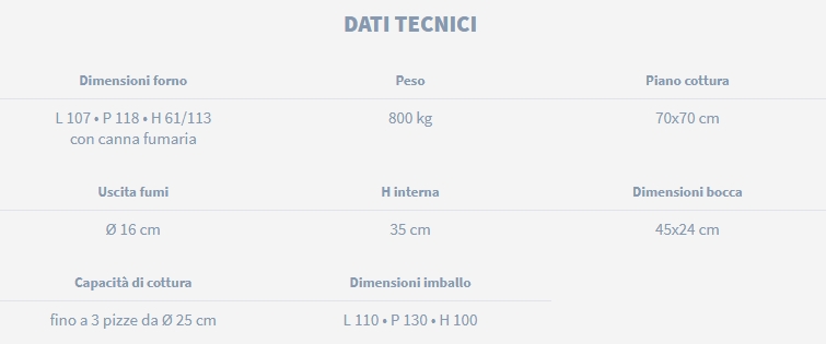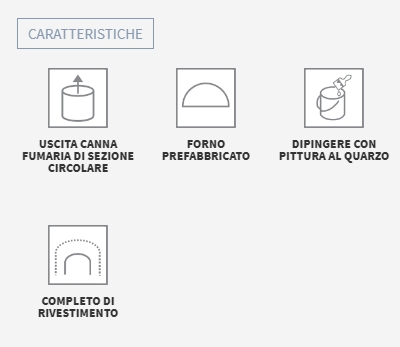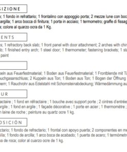 uscita fumi; 2 cupole in argilla; 1 fondo in argilla; 1 arco bocca di finitura; 1 porta in acciaio; 1 termometro; graffe di fissaggio; 1 canna fumaria in acciaio inox con
