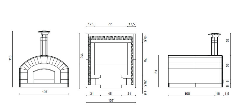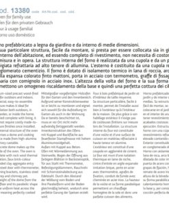 Forno prefabbricato a legna da giardino di medie dimensioni. La struttura interna del forno è realizzata da una cupola e da un piano fuoco in pigiata refrattaria ad alto tenore di allumina. L’esterno è costituito da una cupola realizzata in conglomerato cementizio. Il forno è dotato di isolamento termico in lana di roccia, arco bocca in argilla espansa colorato finto mattoni, porta in acciaio con termometro, graffe di fissaggio, canna fumaria con comignolo in acciaio inox. L’altezza della volta del forno e la sua forma parabolica permettono un omogeneo riscaldamento della base e quindi una perfetta cottura dei cibi.