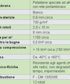 Membrana bugnata in polietilene estruso ad alta densità, accoppiata ad una rete porta intonaco termosaldata, con volume d’aria dietro le bugne di 5,5 l/m², un peso minimo di 700 gr/m² e resistenza meccanica alla compressione maggiore di: > 15 t/m2 circa 150 kN/m².
