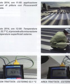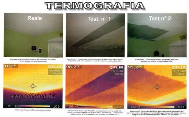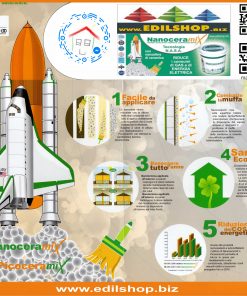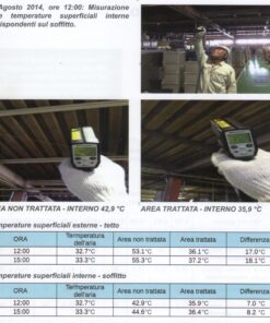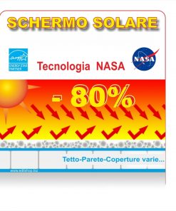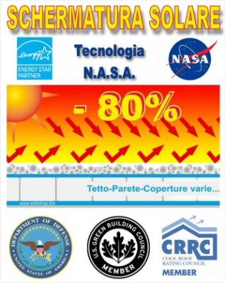 Brevetto della NASA in grado, con una sola mano di 1 mm. di donare all’interno una R. termica 1.05 pari ad uno spessore di isolante in polistirene di 3-4 cm. Anche, se il concetto è diverso da un coibente tradizionale dato l’effetto “termo-riflettente” Applicato in interno si riducono le spese di riscaldamento di circa un 20-30% si contrastano/eliminano le muffe causate da ponti termici, aumento del comfort abitativo. Se applicato all’esterno il risparmio energetico si traduce in locali più freschi in quanto si riesce a diminuire la temperatura sul muro anche di 10° eliminando l’effetto “accumulo” che invece alla sera continua ad irradiare il caldo assorbito della giornata. Con coprenti, su coperture in lamiera, basculanti garage, silos, tettoie varie, camper, caravan, roulotte ect. Il respingimento dell’irradiazione solare è dell’ 80%