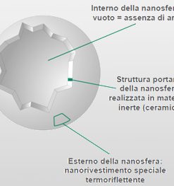 La nanosfera ceramica presenta caratteristiche sia di isolamento dal calore, che di riflessione termica del calore radiante; il composto caratterizzato da microsfere, contenenti nanotecnologie, va miscelato secondo le dosi consigliate in una qualsiasi vernice o idropittura (acrilico, silossanico, semitraspirante, lavabile ecc., ma ad esempio anche in uno smalto a solvente o simili per trattamento isolante di container metallici e silos criogenici, o per l’esterno di camper, caravan e roulotte).