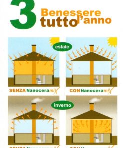 BENESSERE TUTTO L’ANNO. Nanoceramix applicato all’esterno. Le pareti respingono il calore radiante del sole mantenendo fresco l’interno dell’edificio nei mesi più caldi. Nanoceramix applicato all’interno. Le pareti trattengono il calore del riscaldamento limitando la dispersione all’esterno nei mesi freddi. Applicando 2 strati di vernice contenente Nanoceramix conferiscono alla parete trattata una resistenza termica aggiuntiva equivalente a 1,05 mq. C°/W valore comparabile ad un cappotto di oltre 3 cm. Polistirolo espanso. La soluzione ideale consiste nell’applicare Nanoceramix sia all’interno che all’esterno dell’edificio, in modo da avere un isolamento aggiuntivo equivalente ad oltre 3 cm. di EPS durante tutto l’anno (valori certificati dai laboratori Geoscience).