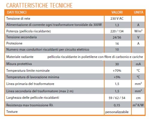 L’inserimento di un film a ridotto spessore (60 micron) a base di carbonio, consente di combinare un efficace aumento delle prestazioni termiche delle pareti, a un sistema di irraggiamento elettrico a bassa tensione (24V/36V) innovativo e non invasivo.