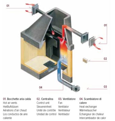 Esso va posizionato nella parete di fondo del focolare occupando internamente 10 cm di profondità, in tale posizione si concentra infatti l’80% del calore prodotto dal caminetto. Un elettro-ventilatore, posto sotto la base del caminetto stesso, avente una portata di 250 mc/h, convoglia l’aria attraverso la “camera di riscaldamento” dove viene appunto riscaldata per poi venire immessa nel locale attraverso le eleganti bocchette poste sulla cappa.
