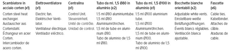 L’elettro-ventilatore, dotato di centralina, si attiva automaticamente qualora la temperatura nello scambiatore raggiunga i 50°C, tramite un termostato da applicare al tubo di uscita dell’aria calda.