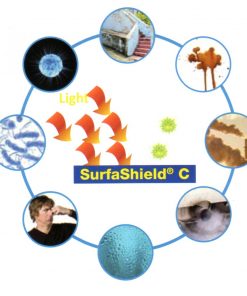 SurfaShield C agisce assorbendo la luce circostante e trasformandola in un agente chimico. Come un catalizzatore semiconduttore, le nanoparticelle di SurfaShield sono attivate dalla luce e producono composti ossidanti di breve durata: ossigeno e radicali ossidrili. Batteri, virus, muffa, inquinanti gassosi, odori, macchie vengono attaccati e trasformati in composti inorganici non pericolosi. Pertanto le superfici trattate si mantengono pulite in modo attivo. SurfaShield non è solo uno scudo attivo che protegge le Superfici: quando la luce agisce sulle nanoparticelle, le superfici diventano superidrofiliche e, come conseguenza, gli inquinanti vengono “lavati via”. SurfaShield agisce inoltre come purificatore dell’aria, perché decompone sostanze organiche pericolose, come i componenti organici volatili (COV o VOC), i gas bruciati delle automobili e gli ossidi di azoto. Come risultato la nanotecnologia garantisce in modo permanente un ambiente più pulito e più sano, semplicemente assorbendo la luce. Caratteristiche