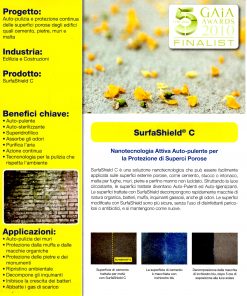 SurfaShield C è una formulazione liquida, progettata e prodotta da NanoPhos S.A., che conferisce reali proprietà autopulenti ed autoigienizzanti ad un’ampia gamma di superfici porose utilizzate nell’edilizia. Può essere applicato con rullo, pennello o spruzzo. Sfruttando i risultati ottenuti dalla nanotecnologia si assicurano l’efficacia nel tempo ed il minimo cambiamento dell’aspetto originale delle superfici trattate.